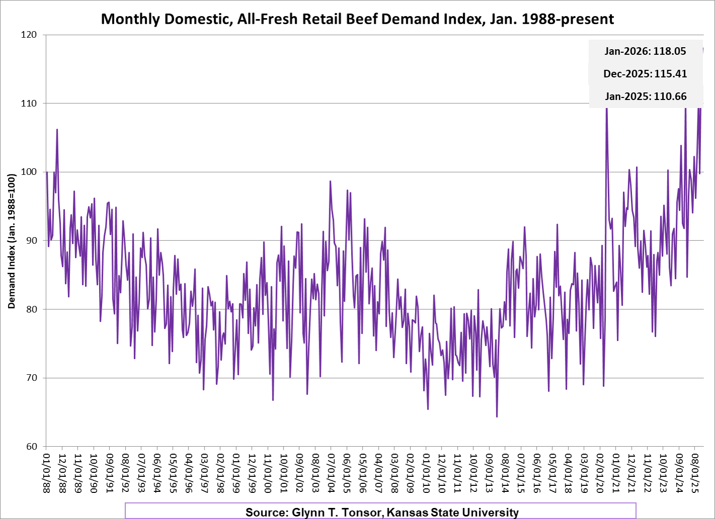 Monthly Domestic, Retail All-Fresh Beef Demand Index, 1988-present